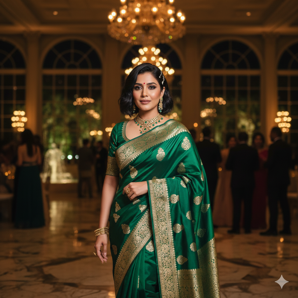 - රාත්රී කාලයේ නම්: රෑ වෙඩින් එකක් කියන්නේ ඔයාට ඕනෑ තරම් “ග්ලැමරස්” (Glamorous) වෙන්න පුළුවන් වෙලාවක්. තද කොළ (Emerald Green), රතු (Maroon), තද දම් (Plum) හෝ රෝයල් බ්ලූ (Royal Blue) වගේ “Jewel Tones” රාත්රියේ ලයිට් එළියට මාරම වටිනා පෙනුමක් අරගෙන එනවා. ඒ වගේම රන්වන් (Gold) හෝ ලෝකඩ (Bronze) පැහැති ඇඳුම්වලිනුත් රෑ සාදයකට ලොකු ආකර්ෂණයක් ගන්න පුළුවන්.