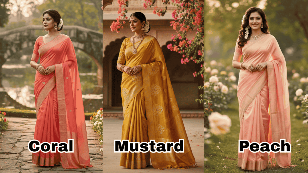 ගොඩක් අය හිතන්නේ උදේ වෙඩින් එකකට නම් ලා පාට (Pastel colors) අඳින්න ඕන කියලා. හැබැයි මතක තියාගන්න, ඕනෑවට වඩා ලා පැහැති පාටවල් (උදාහරණයක් විදියට බේබි පින්ක්, ලා නිල්) නිසා අපේ හමේ තියෙන ස්වභාවික දීප්තිය මැකී ගිහින්, අපිව නිකන් අසනීප වෙලා වගේ පේන්න පුළුවන්. ඒ වෙනුවට මස්ටඩ් (Mustard), කොරල් (Coral), පීච් (Peach) හෝ ටෙරාකොටා (Terracotta) වගේ උණුසුම් වර්ණ තෝරාගන්න. ඒ වගේම Dusty Rose හෝ Olive Green වැනි වර්ණත් ලාංකික අපේ සමට මාරම ලස්සනක් එක් කරනවා.